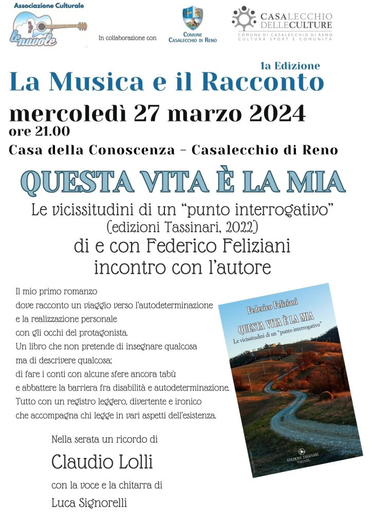 Grazie all’incontro con Danilo Malferrari e l’Associazione culturale Le Nuvole riporto il mio primo romanzo Questa vita è la mia. Le vicissitudini di un “punto interrogativo” a Casalecchio di Reno, ma in un modo diverso. Nella stessa serata infatti ricorderemo insieme Claudio Lolli: cantautore, scrittore e insegnante liceale che ho avuto l’onore di avere per due anni della mia esperienza scolastica.