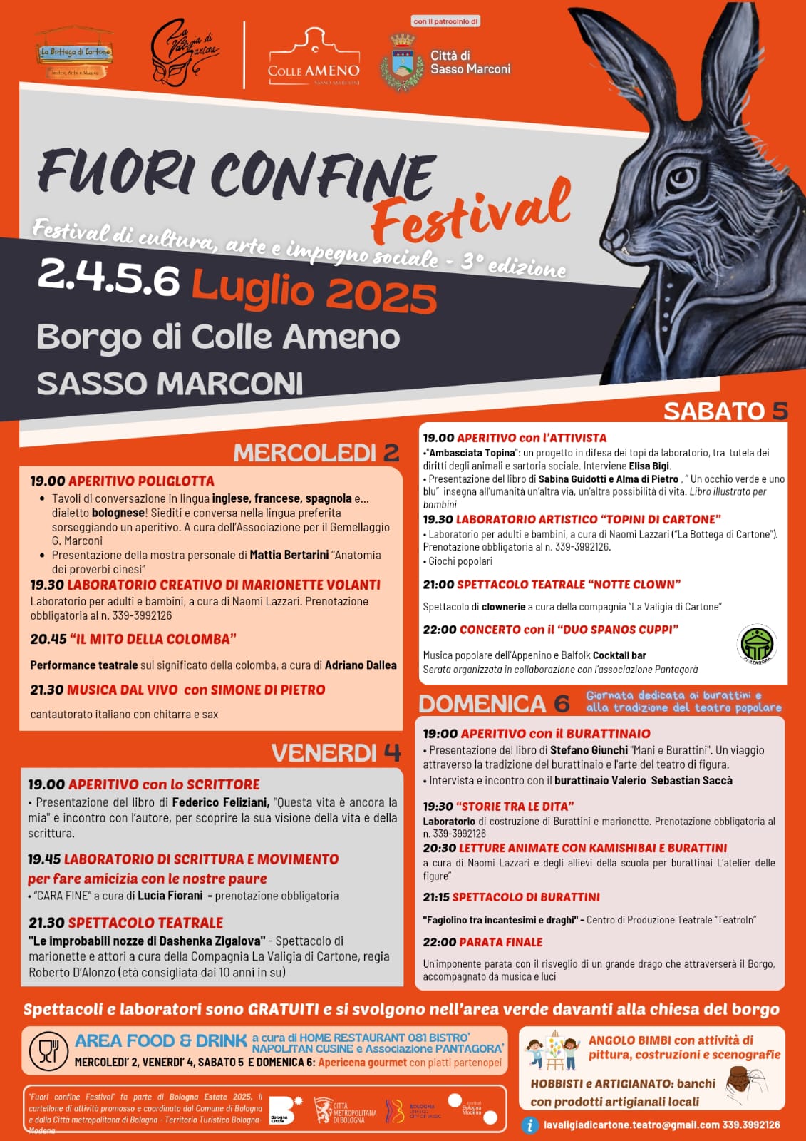 Venerdì 4 luglio sarò ospite del Fuori Confine Festival al Borgo di Colle Ameno a Sasso Marconi. Un evento di arte, musica e teatro organizzato dal La Bottega di Cartone: un luogo dove è possibile approfondire concetti, condividere esperienze e incontrare diverse arti.