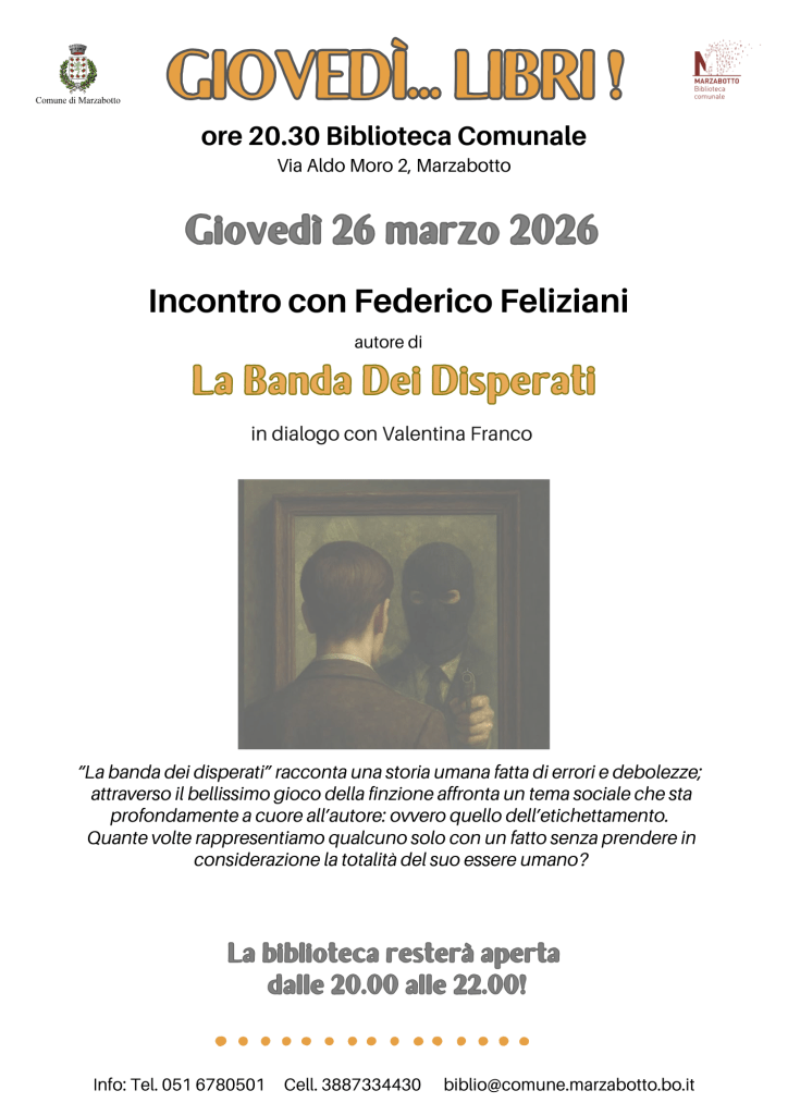 Ci vediamo giovedì 26 marzo alle 20.30 alla Casa della Cultura e della Memoria di Marzabotto (BO). Una nuova occasione per farvi conoscere direttamente i temi, i personaggi e la storia del mio nuovo romanzo.